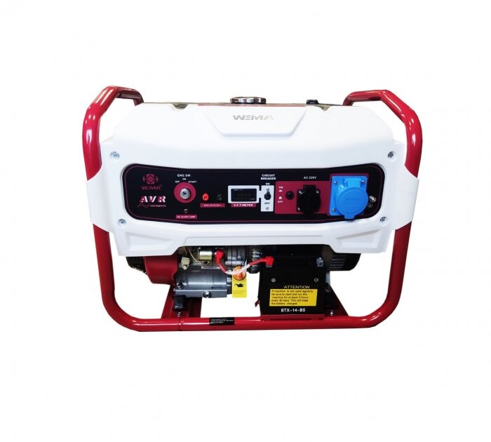 Генератор бензиновий 5кВт Weima WM5500BE - однофазний електрогенратор з номінальною потужністю 5 кВт. Обладнаний економічним двигуном марки Weima WM188F-2. Витрата палива становить 2,8 л / год. Обсяг паливного бака - 25 літрів, що дозволяє працювати електрогенератори 7 годині на одній заправці. Охолодження повітряне примусове. Синхронний тип альтернатора.