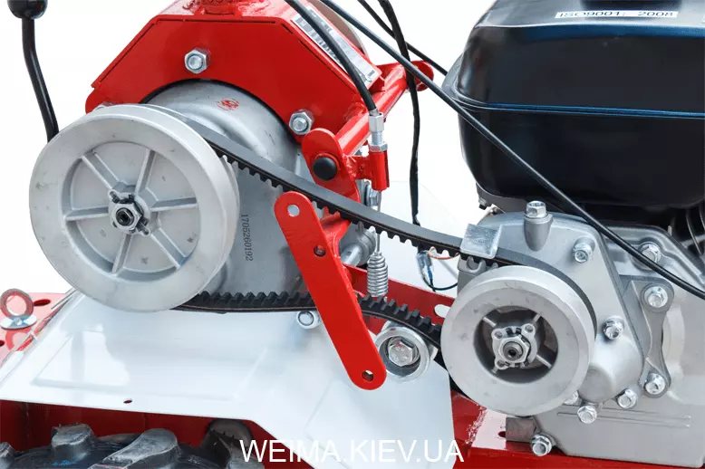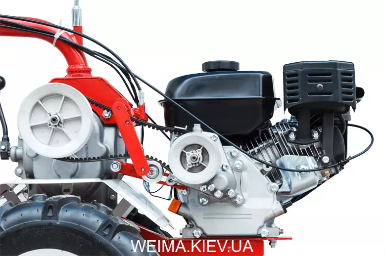 Трансмиссия мотоблока Weima Deluxe Deluxe WM1050 имеет 2 передачи движения вперед и 1 передач(n) назад, редуктор шестеренчатый редуктор конического типа, Тип привода ременная передача, сцепление центробежное, ременное (натяжной ролик). Диаметр полуосей редуктора 25 мм, размер колес 4.00-8 дюймов.